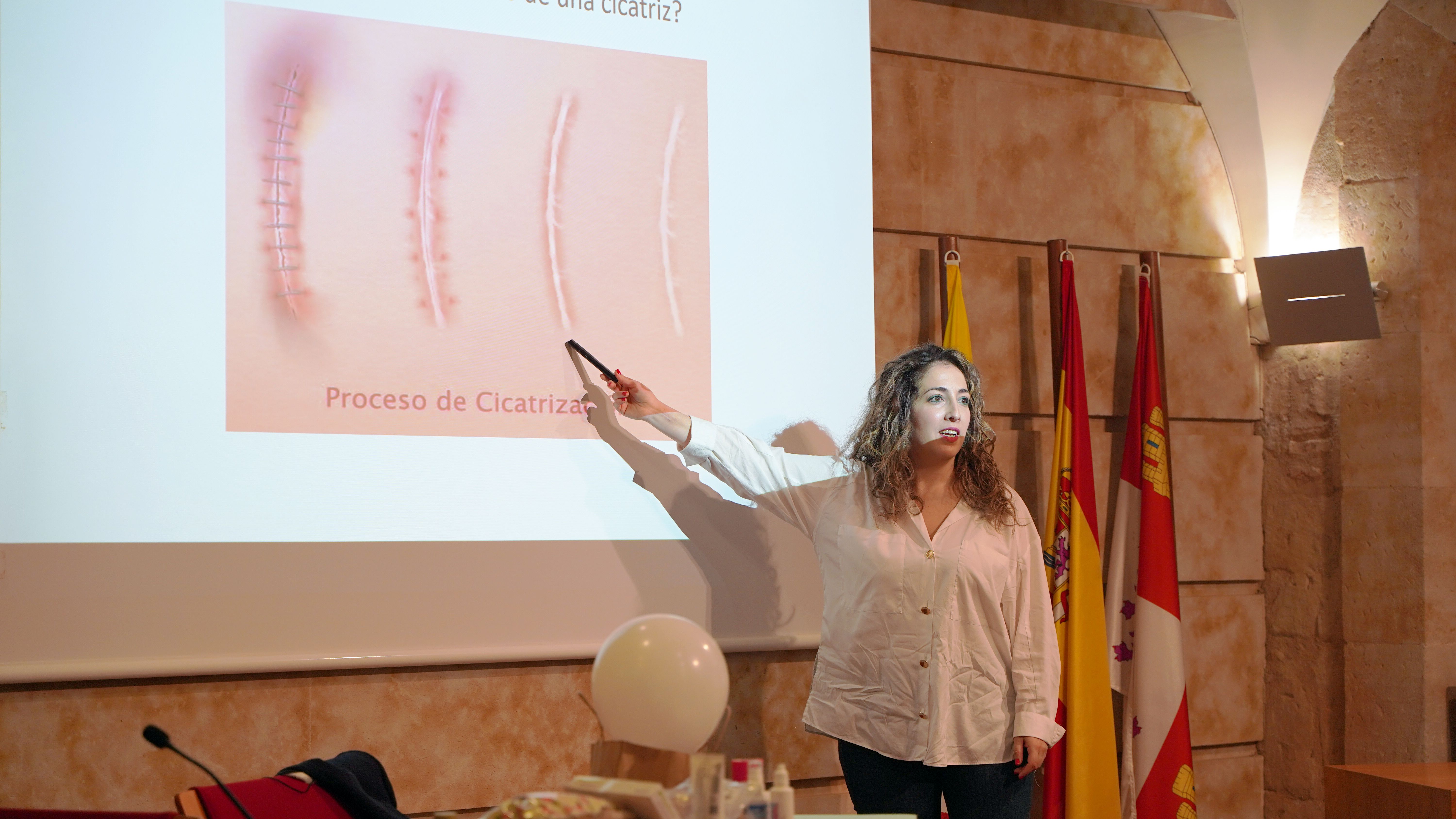Posteriormente, la fisioterapeuta del Servicio Extremeño de Salud Alejandra Cillero ha impartido un taller práctico, en el que ha presentado cómo evaluar y cuál es el tratamiento del tejido cicatricial, así como los fundamentos y aplicaciones que se desarrollan en la Fisioterapia Dermatofuncional, dedicada al tratamiento de la piel y sus apéndices.