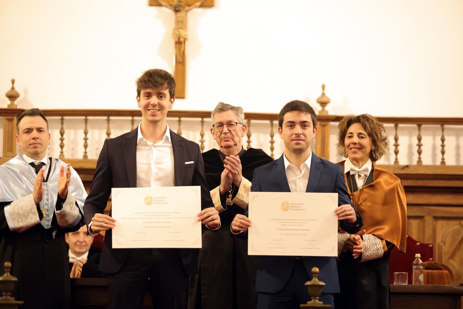 En la conmemoración de la festividad, el Rector, Santiago García-Jalón de la Lama, acompañado por los vicerrectores, ha hecho entrega de los Premios Extraordinarios de Grado y Licenciatura a los alumnos Marina Juanes Franco (Grado en Enfermería); Iria Nieto Rebollo (Grado en Logopedia); Alejandro Sardón Seisdedos (Grado en Comunicación Audiovisual); Jimena Martín Corral (Grado en Publicidad y Relaciones Públicas); Pablo Martín Sánchez (Grado en Ingeniería Informática); Isaac Juan Gento Municio (Licenciatura en Derecho Canónico); Adrián González Villanueva (Licenciatura en Teología Bíblica); Javier Prieto Prieto (Licenciatura en Teología Dogmática) y Guillermo Andrés Gómez Aristizábal (Licenciatura en Teología Práctica).