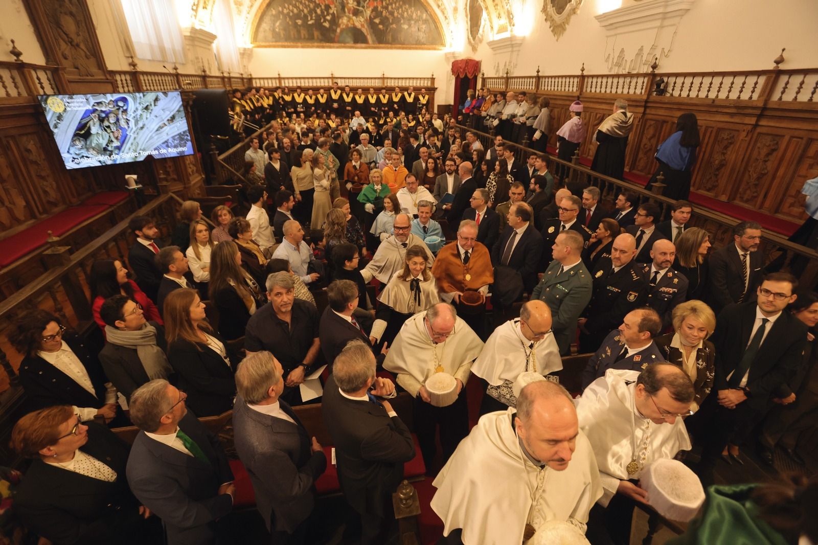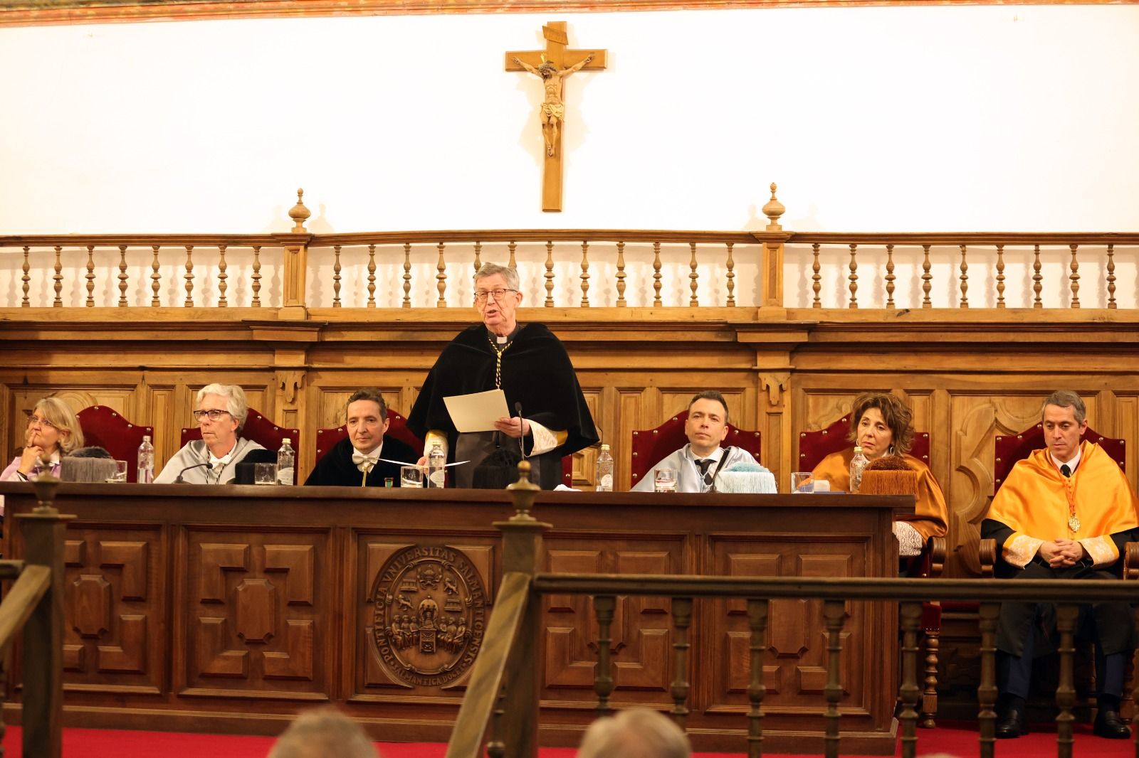 A todos, con la gratitud de la Universidad, el Rector ha recordado las palabras que, según Plutarco, dirigió Pompeyo a los marinos que, por miedo a los vientos contrarios, se resistían a zarpar, comprometiendo con ello la misión de abastecer de grano a Roma: navigare necesse est, vivere non necesse. “Este lema, ‘navegar es necesario, vivir no’, adoptado como blasón por la antigua marina de Castilla, expresa bien la idea de la vida como misión, como entrega a una tarea que nos supera, pero sin la cual el monótono transcurso de las horas no es merecedor del título de vida. Vosotros habéis vivido y lo habéis hecho para el presente y para el futuro y, mediante vuestro trabajo acabado con pulcritud, habéis vivido no sólo para el tiempo, sino también para la eternidad”, ha finalizado.