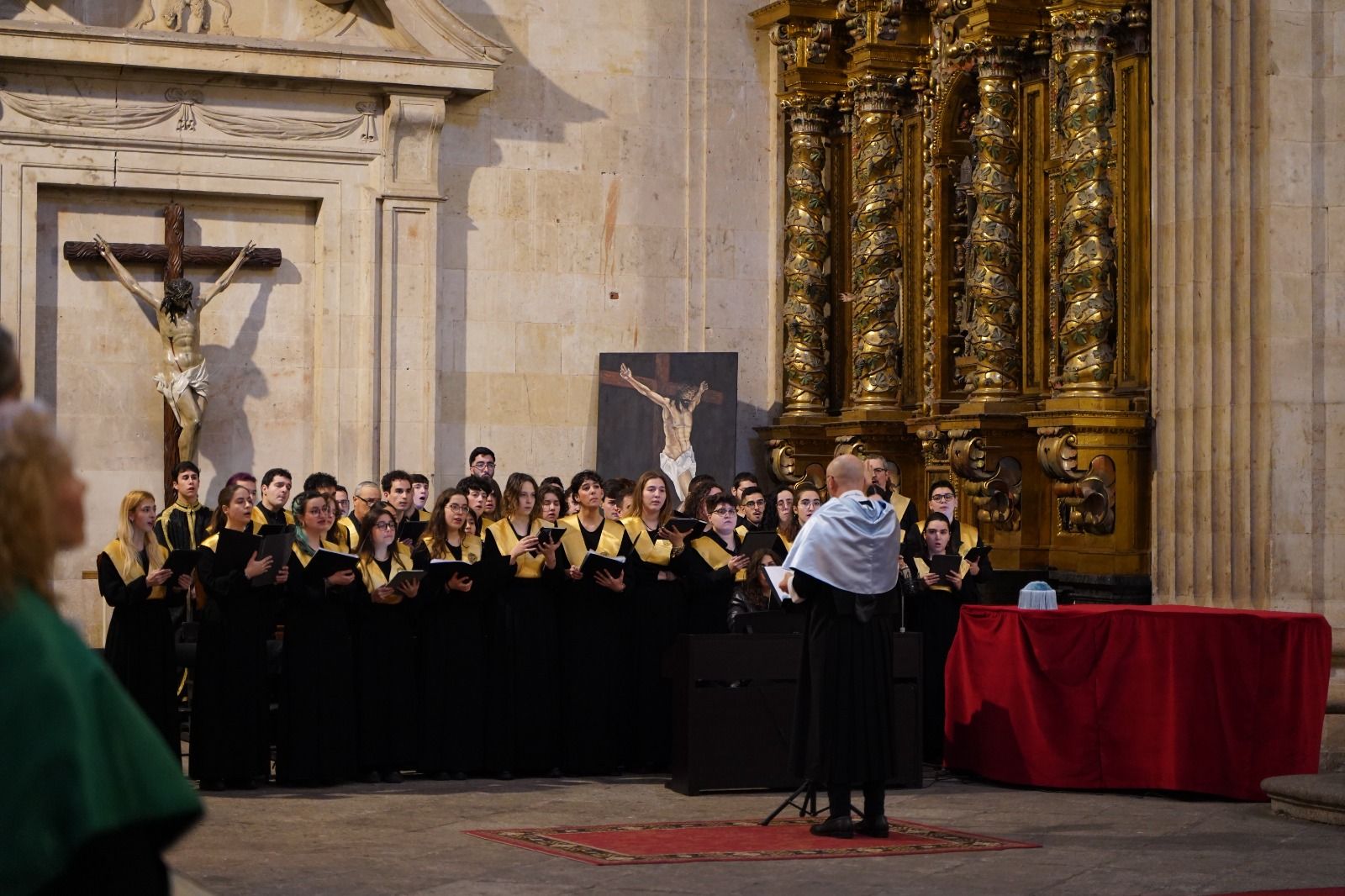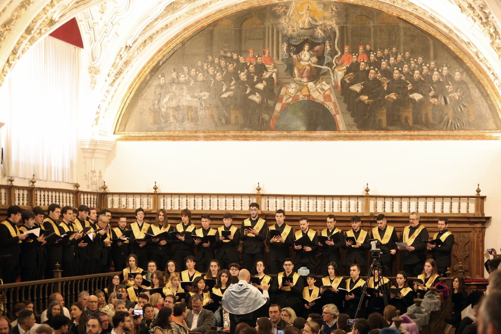 La sesión ha concluido con la interpretación del Gaudeamus Igitur por parte del Coro Tomás Luis de Victoria. Además, la agrupación coral ha estrenado en el acto académico el nuevo Himno de la Universidad, cuya autoría corresponde a Francisco José Álvarez García, vicerrector de Ordenación Académica, Profesorado y Calidad, con la participación de la comunidad universitaria.