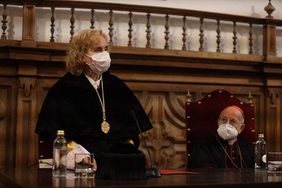Acompañada por el Gran Canciller de la UPSA, cardenal Ricardo Blázquez, arzobispo de Valladolid, Mirian Cortés, ha hecho referencia a unas palabras pronunciadas por el Papa Francisco con las que anima a aprovechar la pandemia de la COVID-19 para construir algo diferente. “Nos interpelan directamente como universidad de la Iglesia a cumplir nuestra función, que no estará principalmente en el desarrollo técnico o científico, sino en la labor educativa, cultural y pastoral.”, ha enfatizado la rectora.