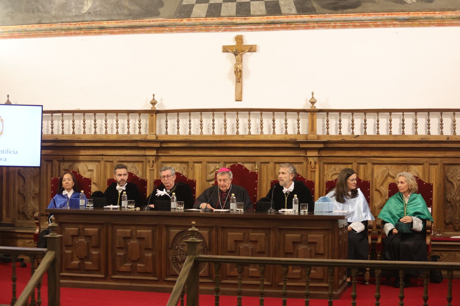 El Acto Académico ha contado, junto a las autoridades académicas de la UPSA, con la asistencia del Gran Canciller de la Universidad, obispo de Ciudad Rodrigo y de Salamanca, Mons. José Luis Retana Gozalo; el arzobispo de Oviedo, Mons. Jesús Sanz Montes, y el obispo de Plasencia, Mons. Ernesto J. Brotóns Tena.