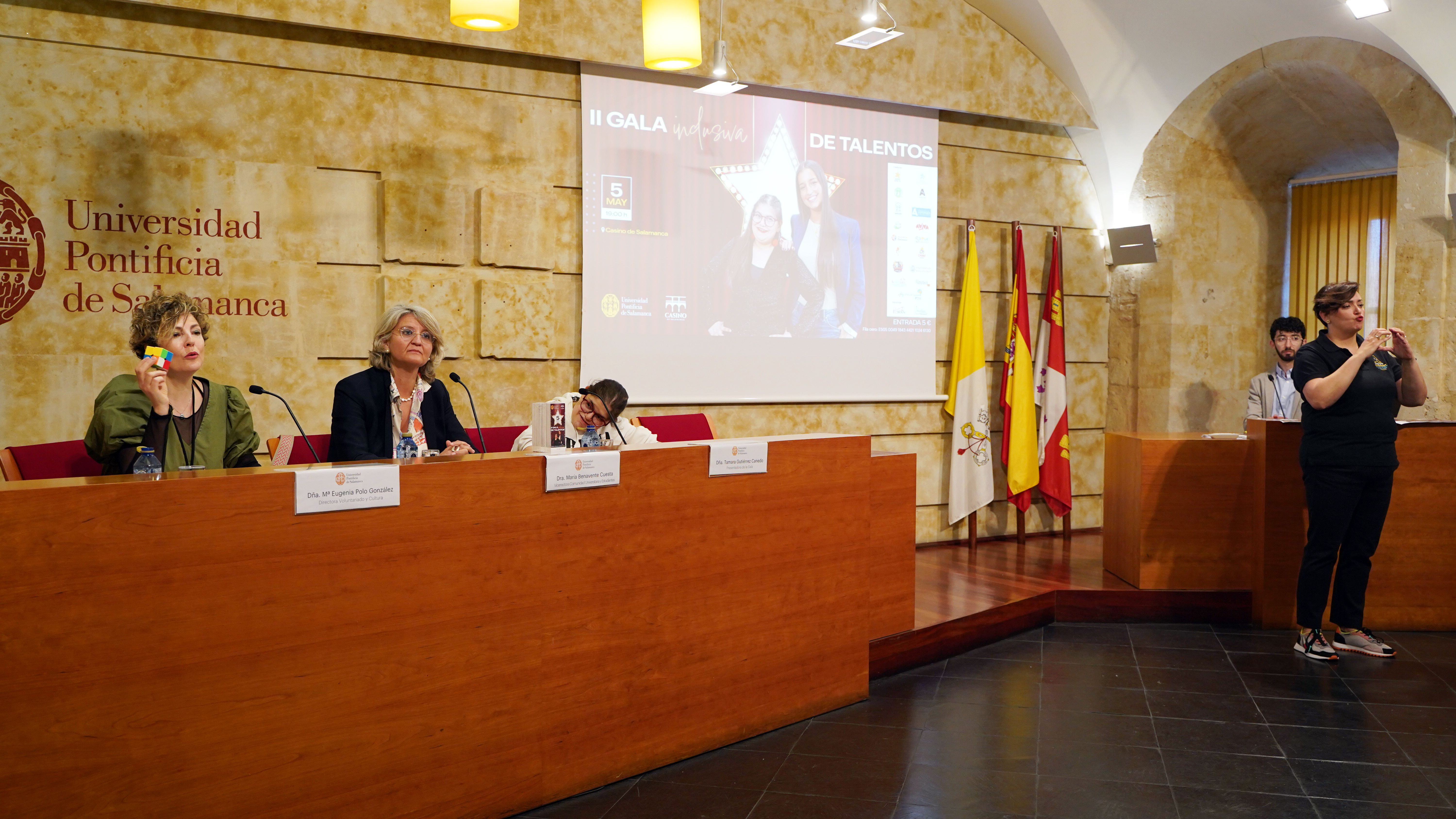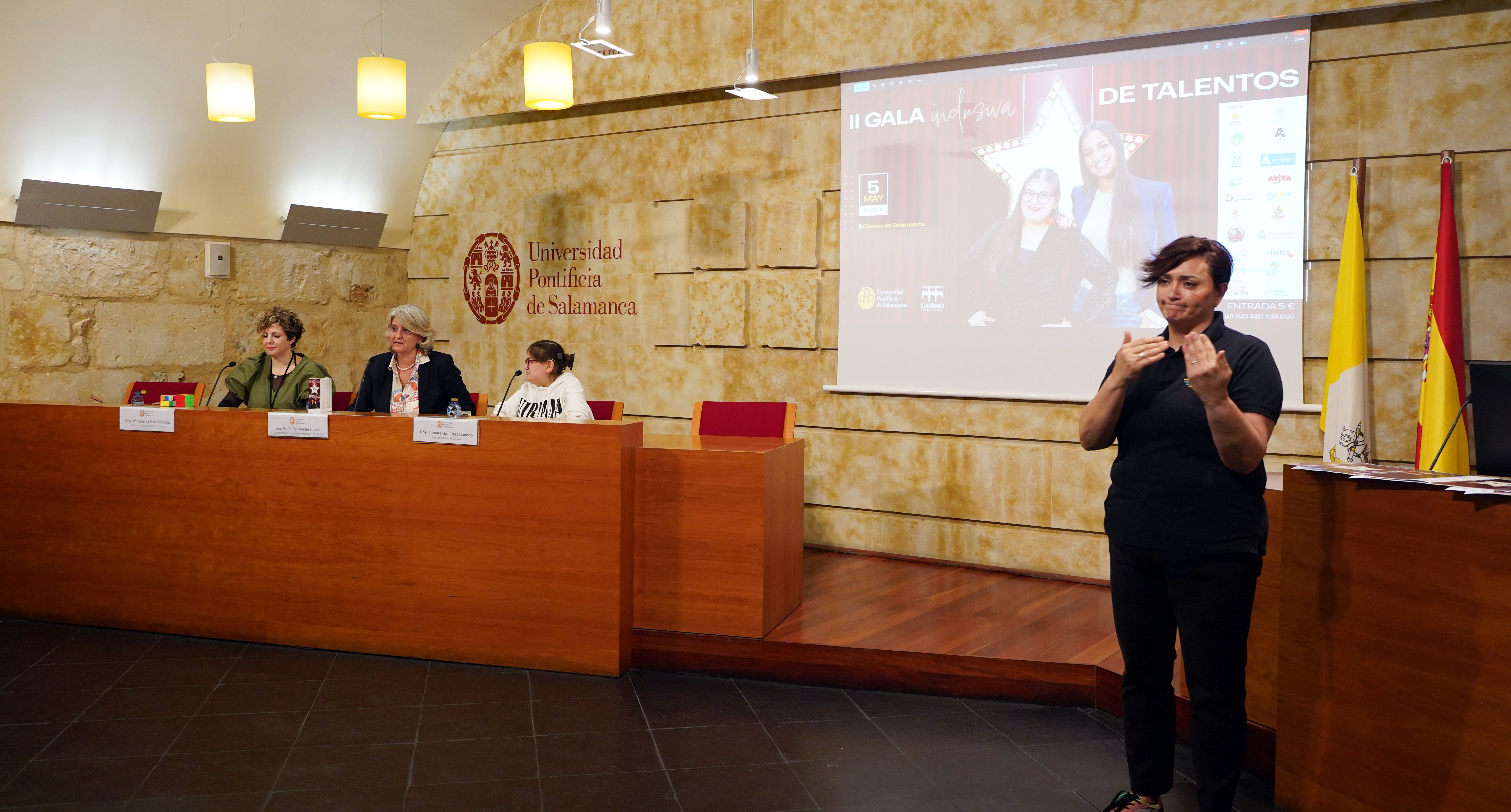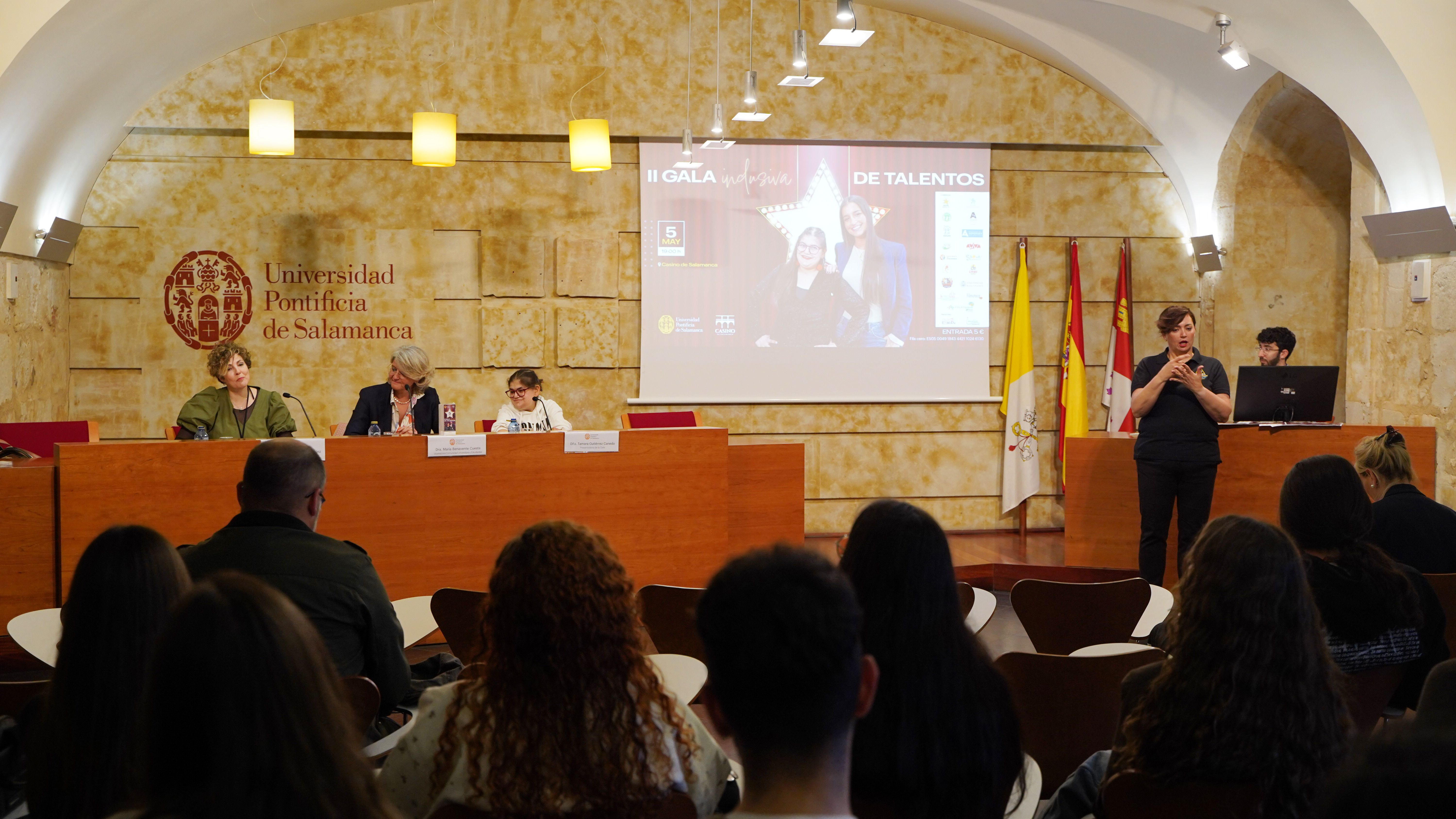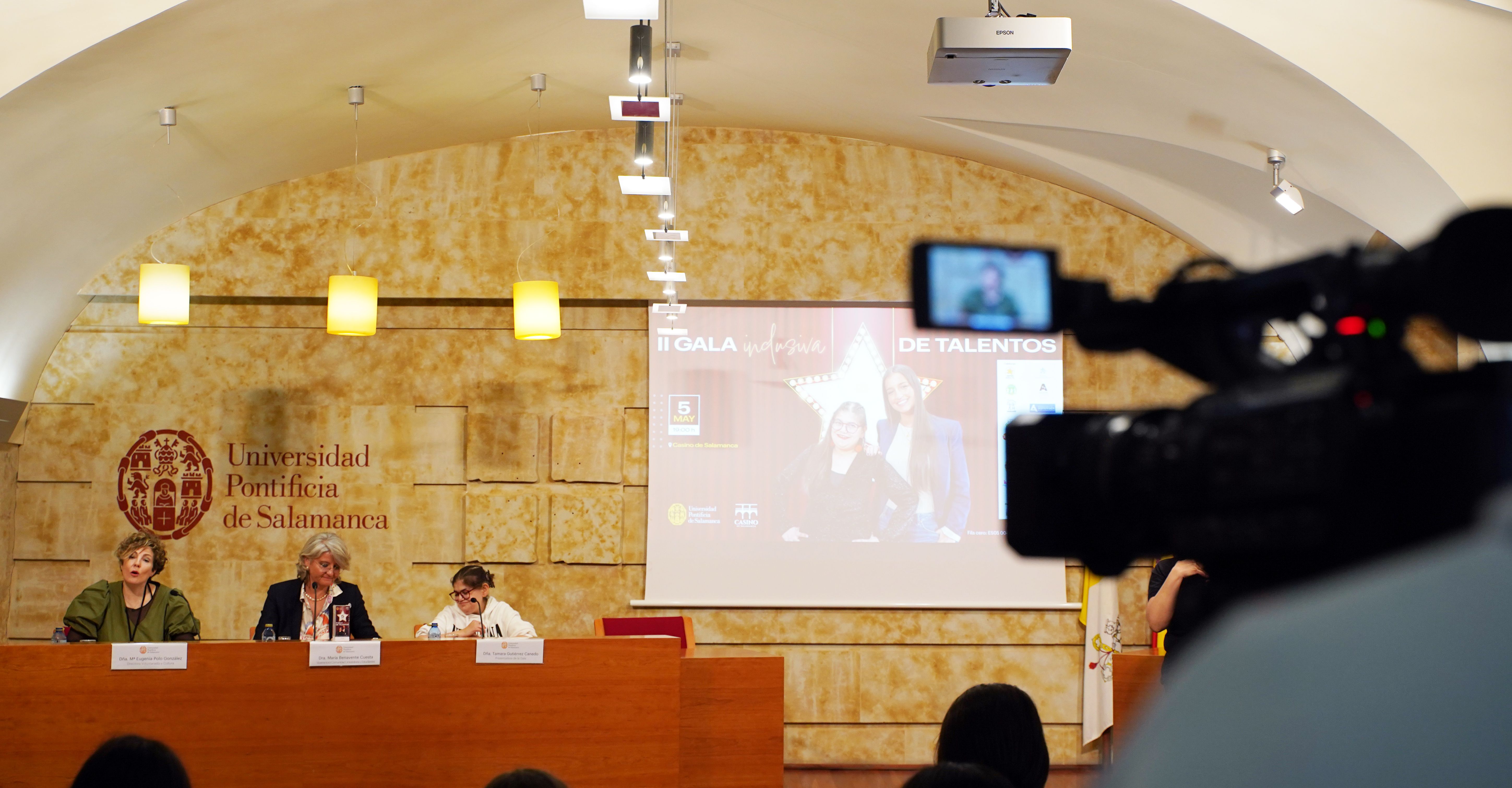 La Universidad Pontificia de Salamanca (UPSA) ha presentado esta mañana la II Gala Inclusiva de Talentos, que se celebrará el próximo 5 de mayo, a las 19:00 horas, en el Casino de Salamanca. El evento contará con numerosas actuaciones culturales, tanto individuales como grupales, relacionadas con la inclusión. La vicerrectora de Comunidad Universitaria y Estudiantes, María Hinojal Benavente Cuesta, acompañada de la directora del Servicio de Voluntariado y Cultura, María Eugenia Polo González, y las presentadoras de la Gala, Tamara Gutiérrez Canedo y Paula Juanes Gil, ha dado a conocer todos los detalles del evento.