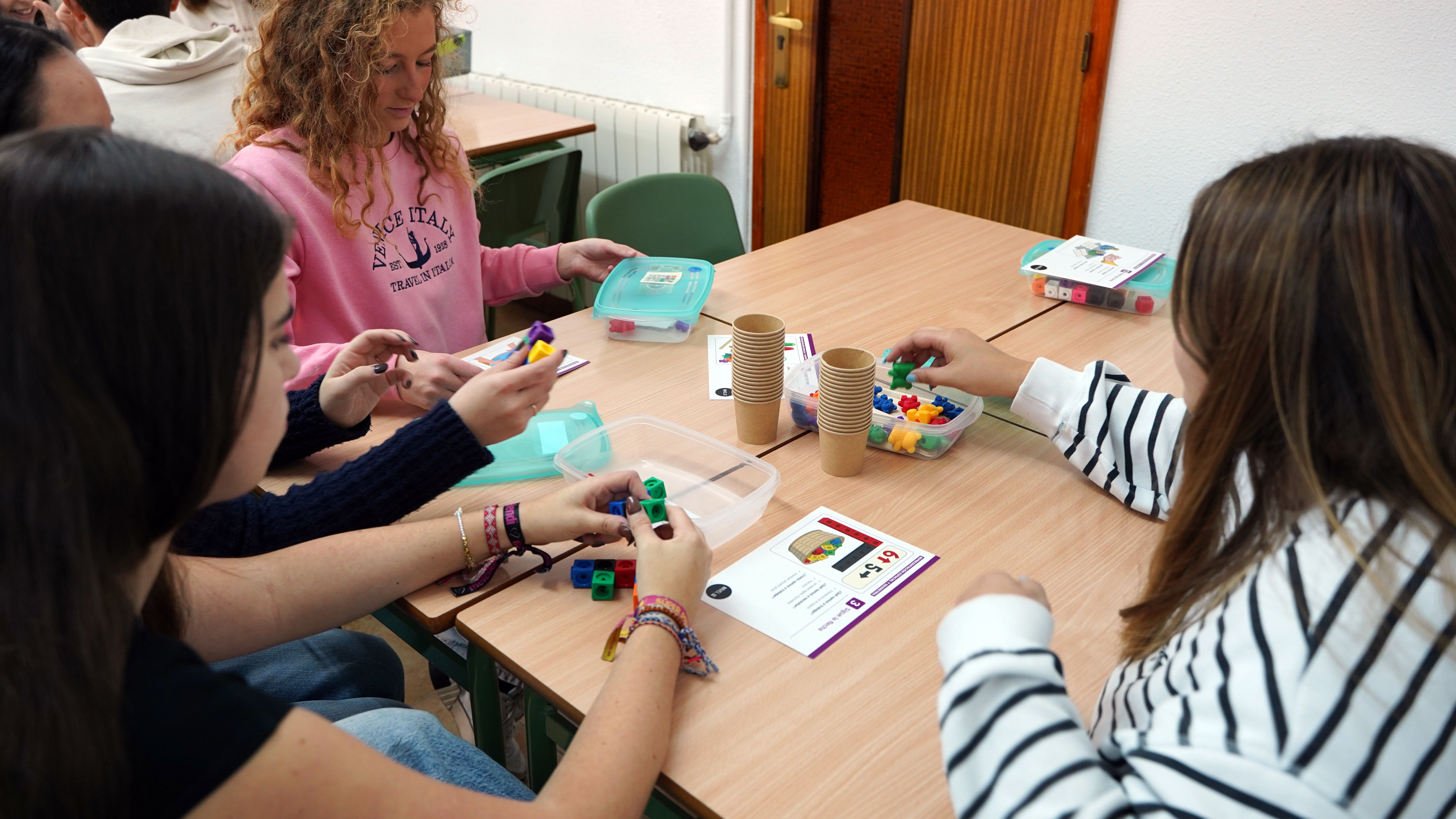 El segundo taller se ha centrado en desarrollar los cuatro bloques temáticos de las Matemáticas (numeración, lógica, medida, representación espacial y geometría) con materiales diferentes de forma manipulativa y con un enfoque más vivenciado. Para ello, han utilizado plastilina, básculas, objetos cotidianos, policubos, eslabones, así como el juego del parchís.