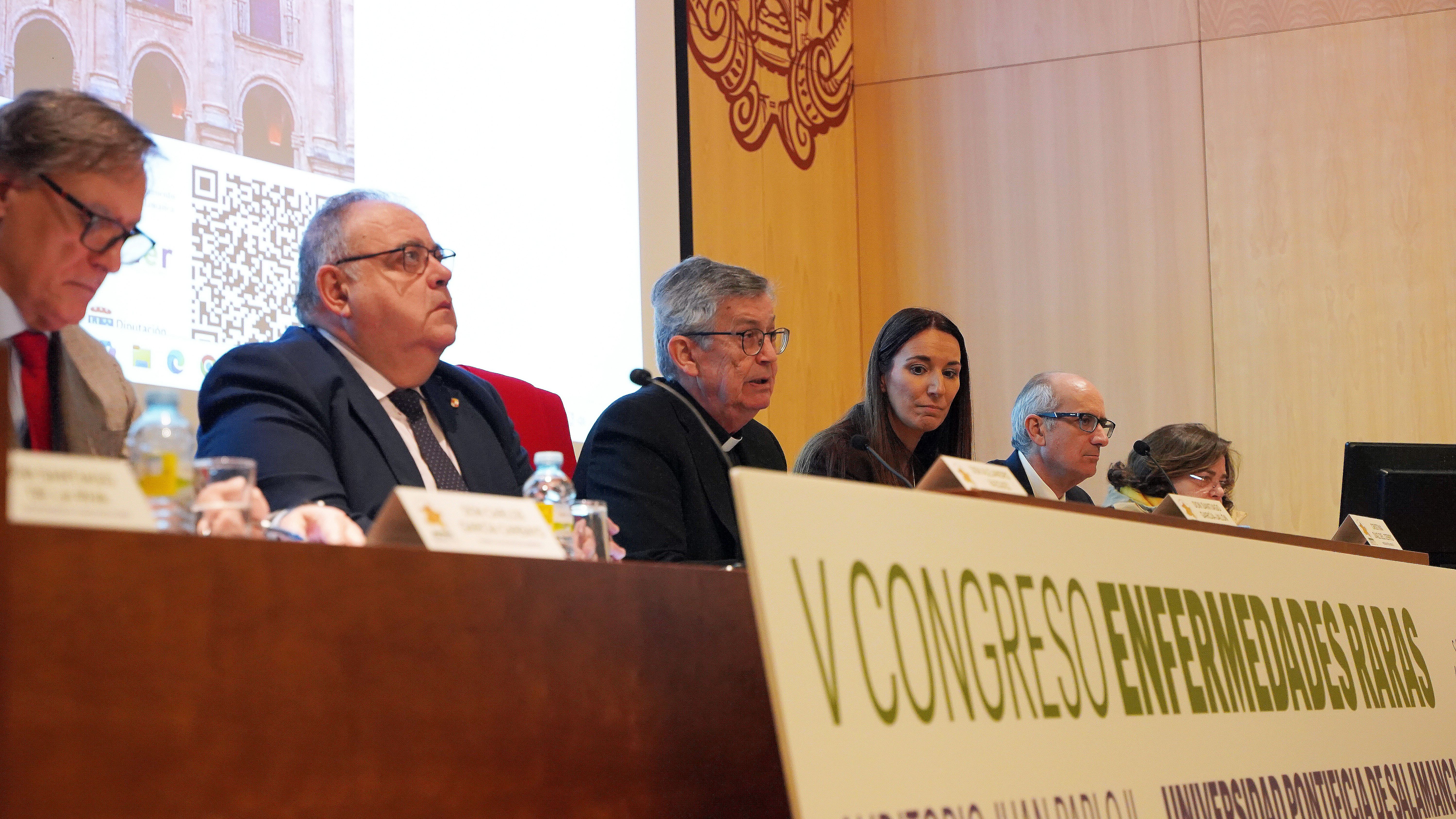 En su intervención, el Rector ha subrayado el compromiso y el papel de la UPSA en este congreso, por cuanto “una universidad cumple su misión cuando pone su conocimiento al servicio de la sociedad. Y pocas causas requieren tanto rigor, cooperación y humanidad como el ámbito de las enfermedades raras”. “Son raras por su prevalencia, pero no lo son en su impacto. Cada una de ellas supone un desafío clínico y sanitario, un reto para la investigación, y una realidad profundamente humana para quienes las padecen y para sus familias. Por eso, hablar de enfermedades raras es hablar también de equidad, de dignidad, de derechos y de justicia sanitaria”, ha añadido.