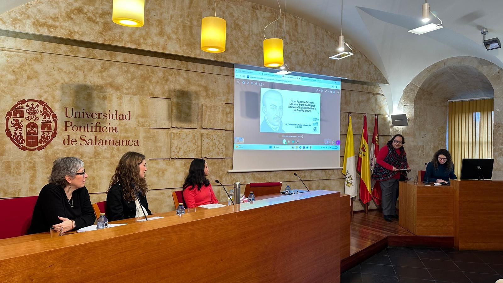 La mesa redonda dedicada a este último tema (mesa 22) ha estado moderada por la profesora María Idoya Zorroza y ha contado con los expertos Xavier Agenjo, Lola Hernando de Larramendi, Patricia Juez, Cindy Rico Carmona, Christiane Birr y Polina Solonets. Las temáticas de debate en este espacio han versado sobre la Escuela de Salamanca a la luz de los metadatos, las fuentes salmantinas enfocadas al futuro (experiencias desde un taller digital) y la edición digital de De Iustitia et Iure, de Luis de Molina.