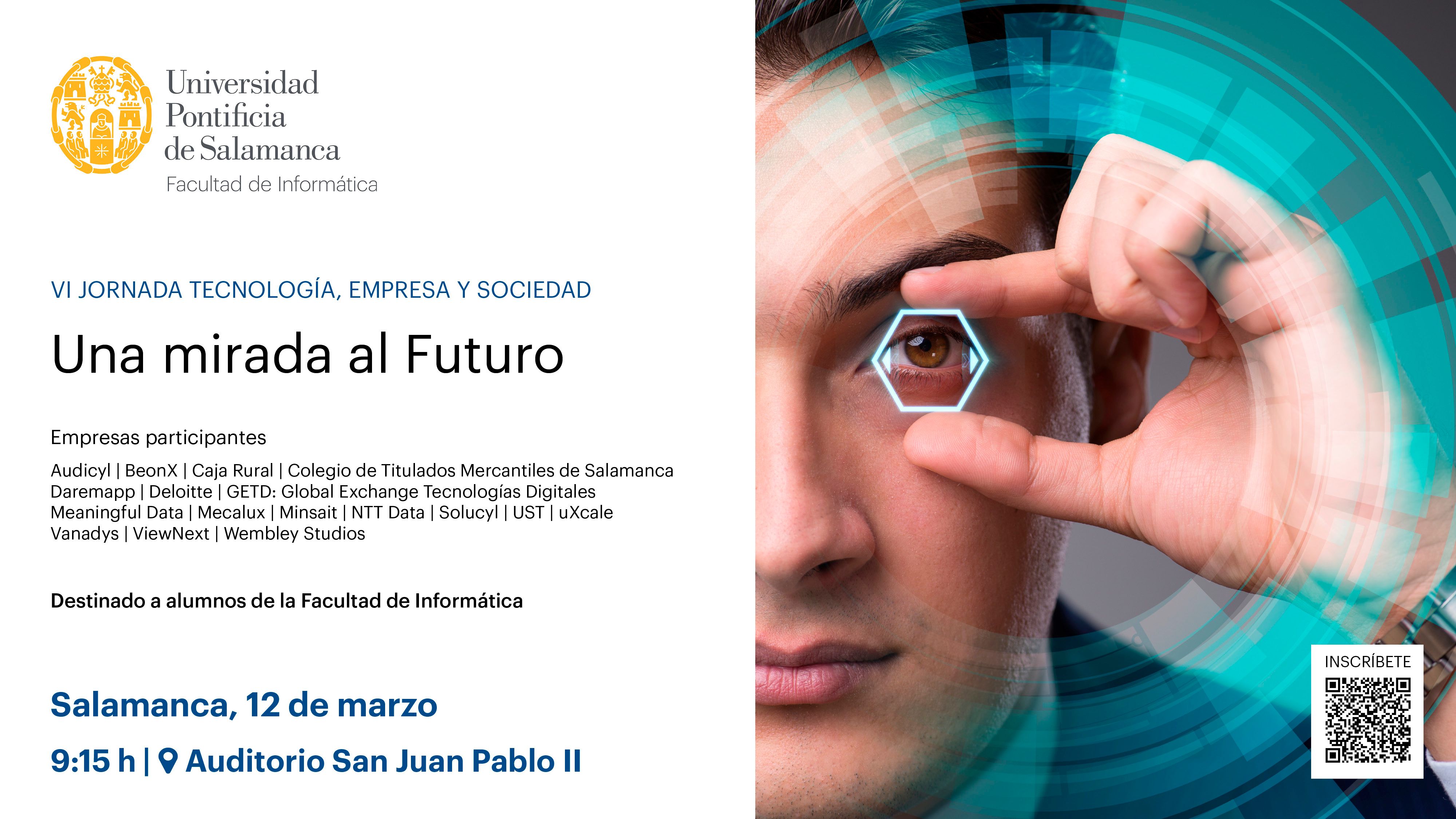 La Facultad de Informática organiza el próximo 12 de marzo la VI Jornada 'Tecnología, Empresa y Sociedad. Una mirada al Futuro'. Las sesiones tendrán lugar en el Auditorio San Juan Pablo II y comenzarán a las 09:15 horas con las palaras de bienvenida del decano de la Facultad, Vidal Alonso, y la coordinadora de prácticas externas, Montserrat Mateos. Para asistir a las conferencias es necesario inscribirse.